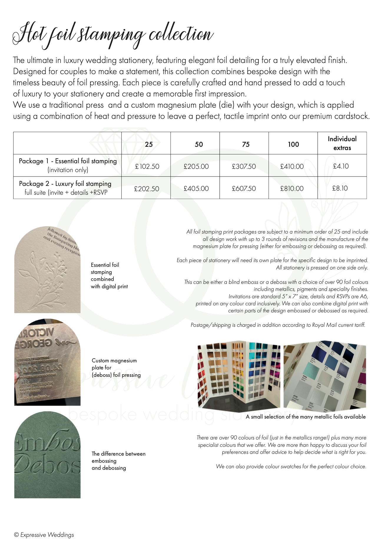 We know that planning a wedding can be stressful, overwhelming and expensive. Our aim is to simplify the process, by providing a range of stationery packages with full transparency on pricing to make ordering simple. We obtain your design brief, you decide the finish you prefer and select the quantity.